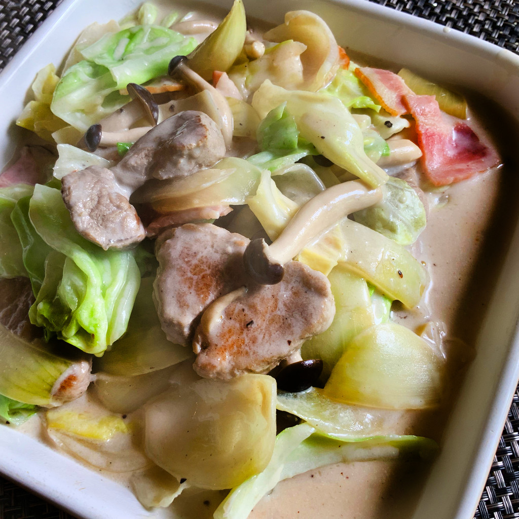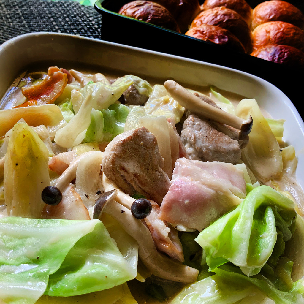 再び煮えてきたら、すぐ(キャベツがくたくたしないように)牛乳で溶いた小麦粉をまわし入れ、とろみがついたら完成です。