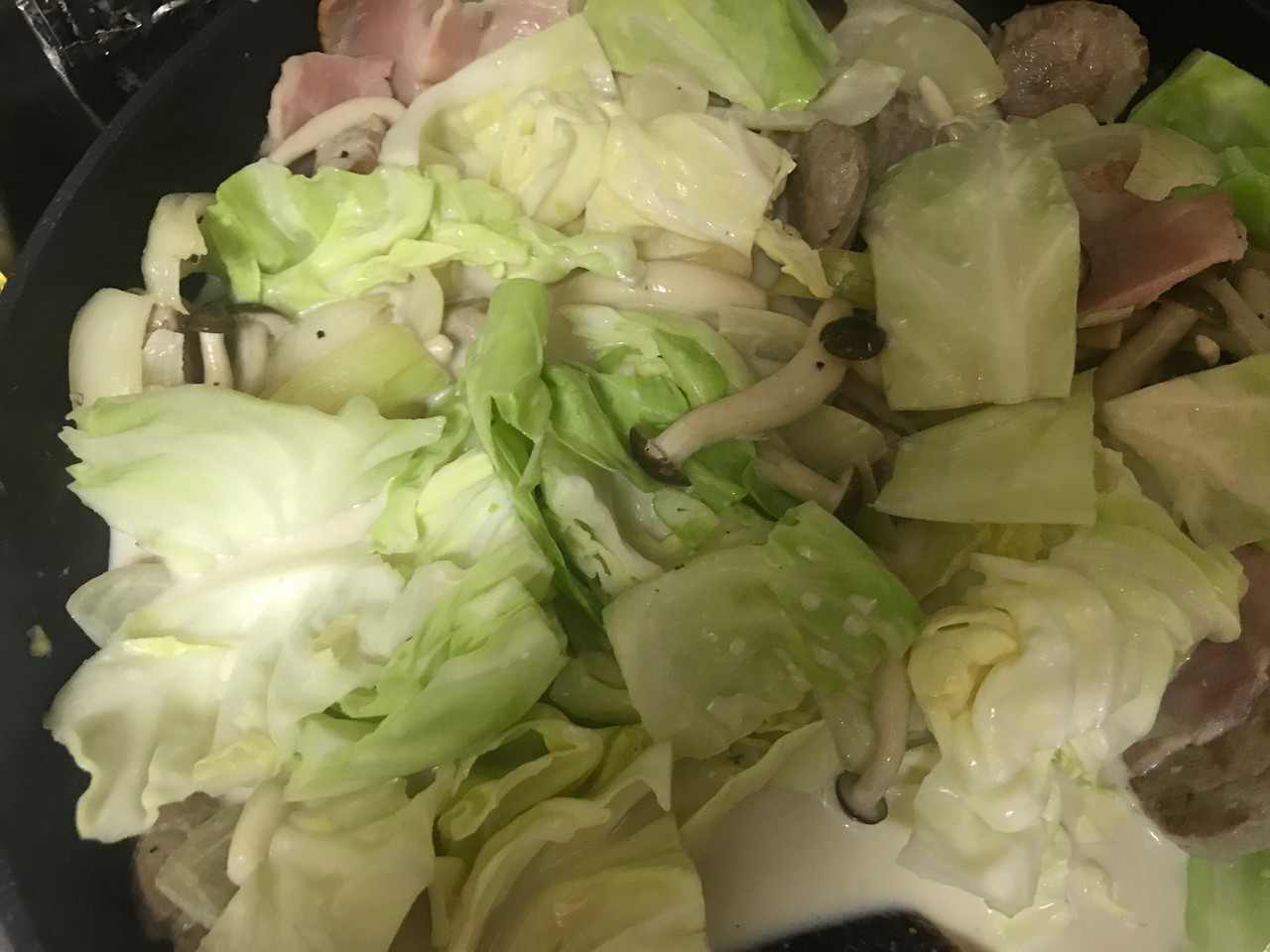 やさしく煮えてきたら、味見をしながら塩コショウして、好きなしょっぱさに着地させ、食べやすい大きさに切ったキャベツを入れます。