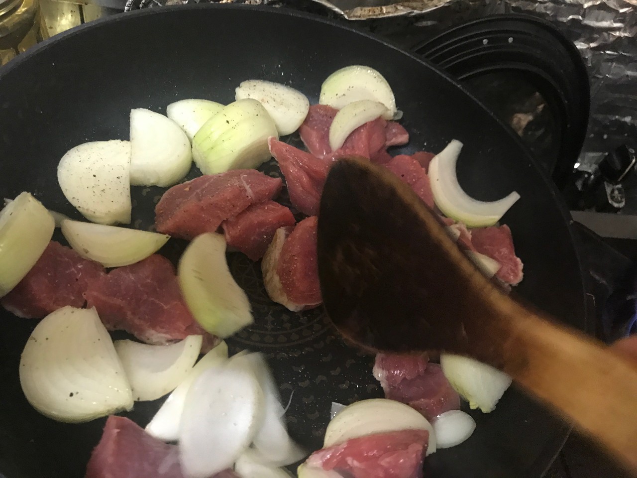 豚ヒレ肉(コマでも、チキンだったりしてもいいんですが)は食べやすい大きさに切って、くし切りにした玉ねぎといっしょに、サラダ油を敷いたフライパンで炒めます。炒めながら、ちょっと強めに塩コショウします☆