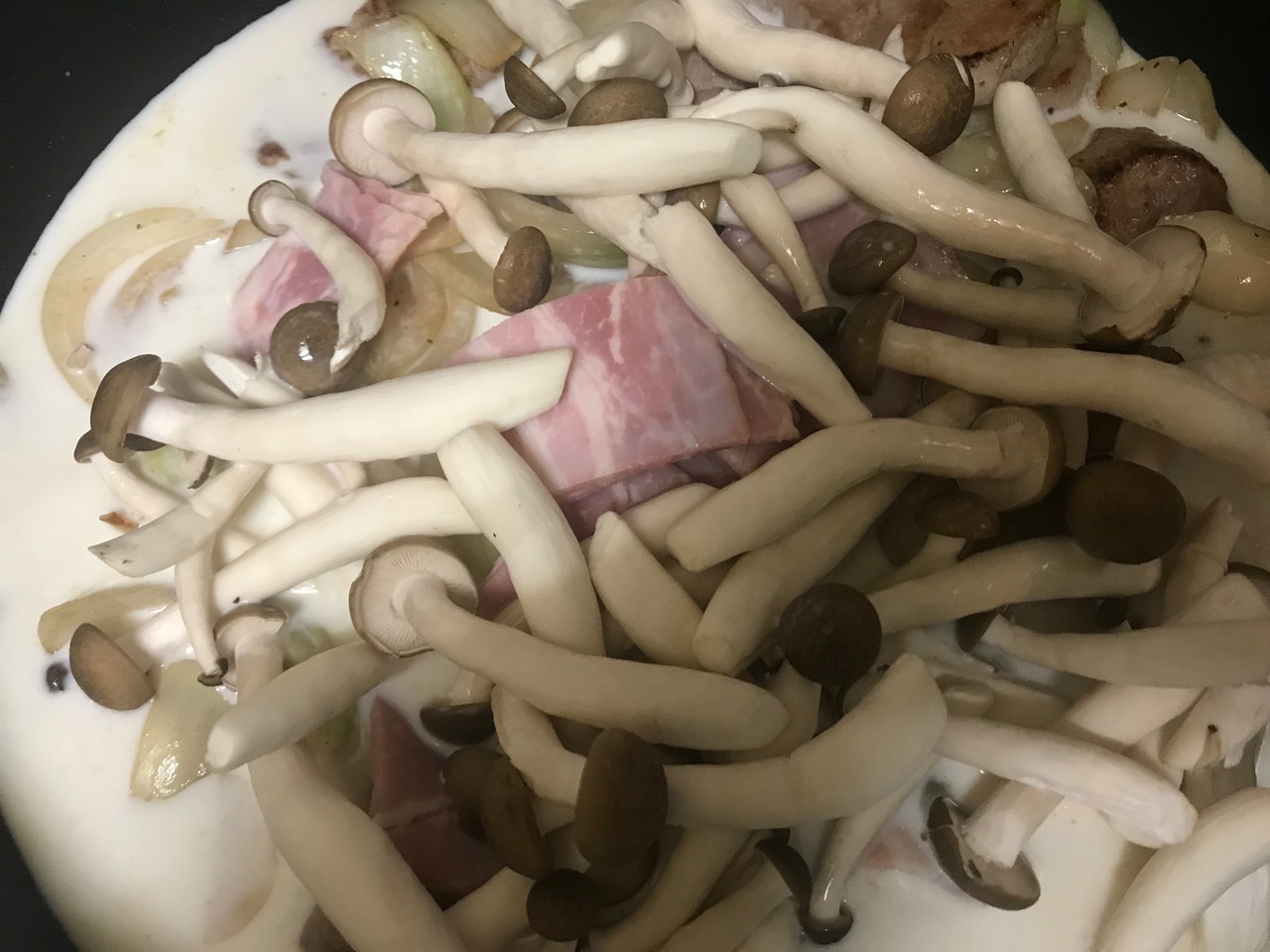 豚肉が焼けて、玉ねぎになんとなく透明感が出てきたら、牛乳500cc、しめじ(マッシュルームでもいいんですが)、ベーコン、スープのもと、みそを入れて、弱火(←火加減大事!)にかけます。