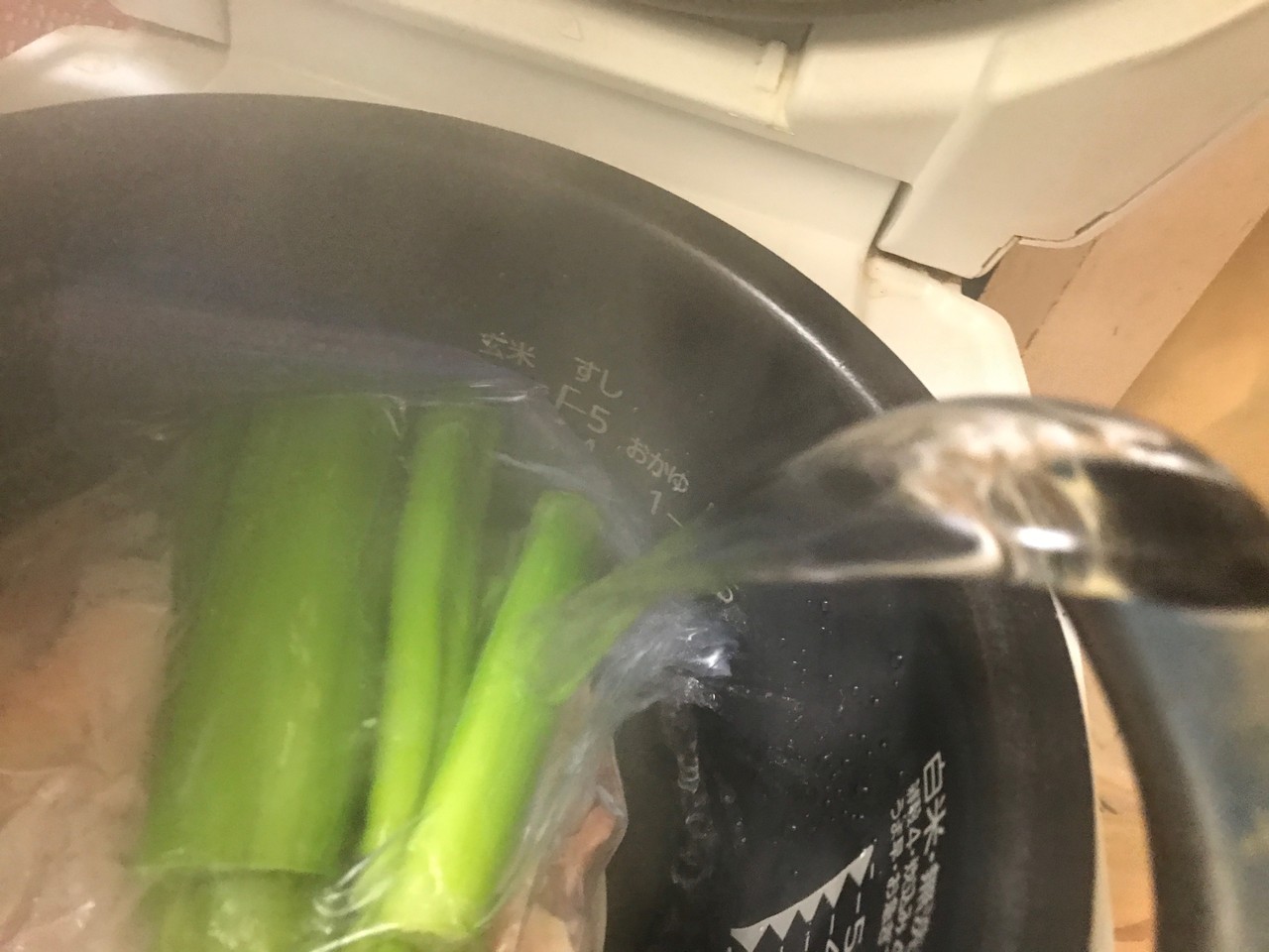 内釜に小皿を敷いた(内釜に袋をくっつけたくない)炊飯器に入れ、熱湯を袋が浸かるぐらい注ぎ、保温のまま2時間放置します。