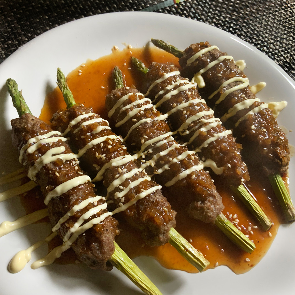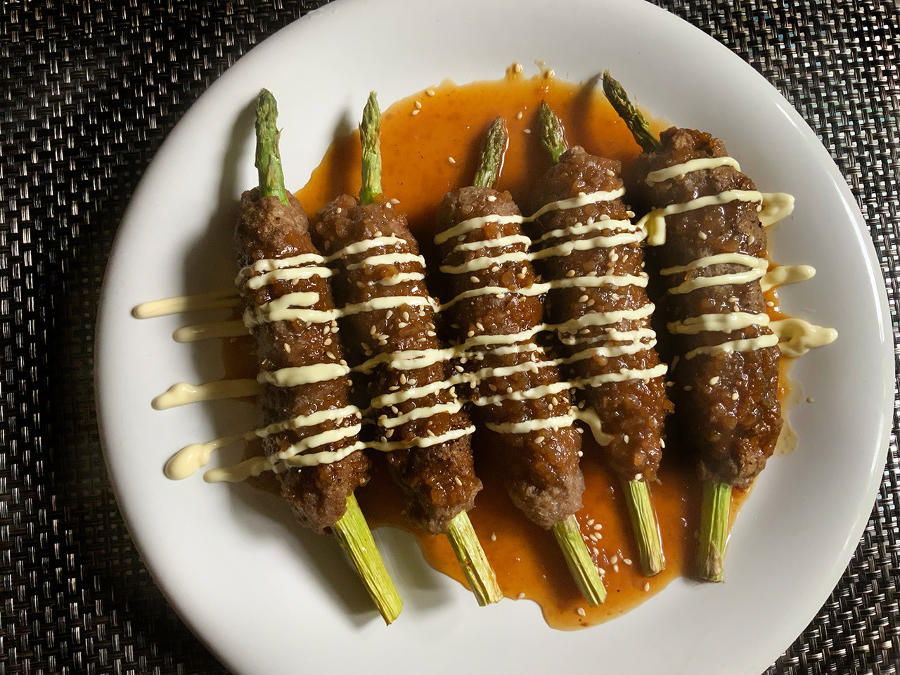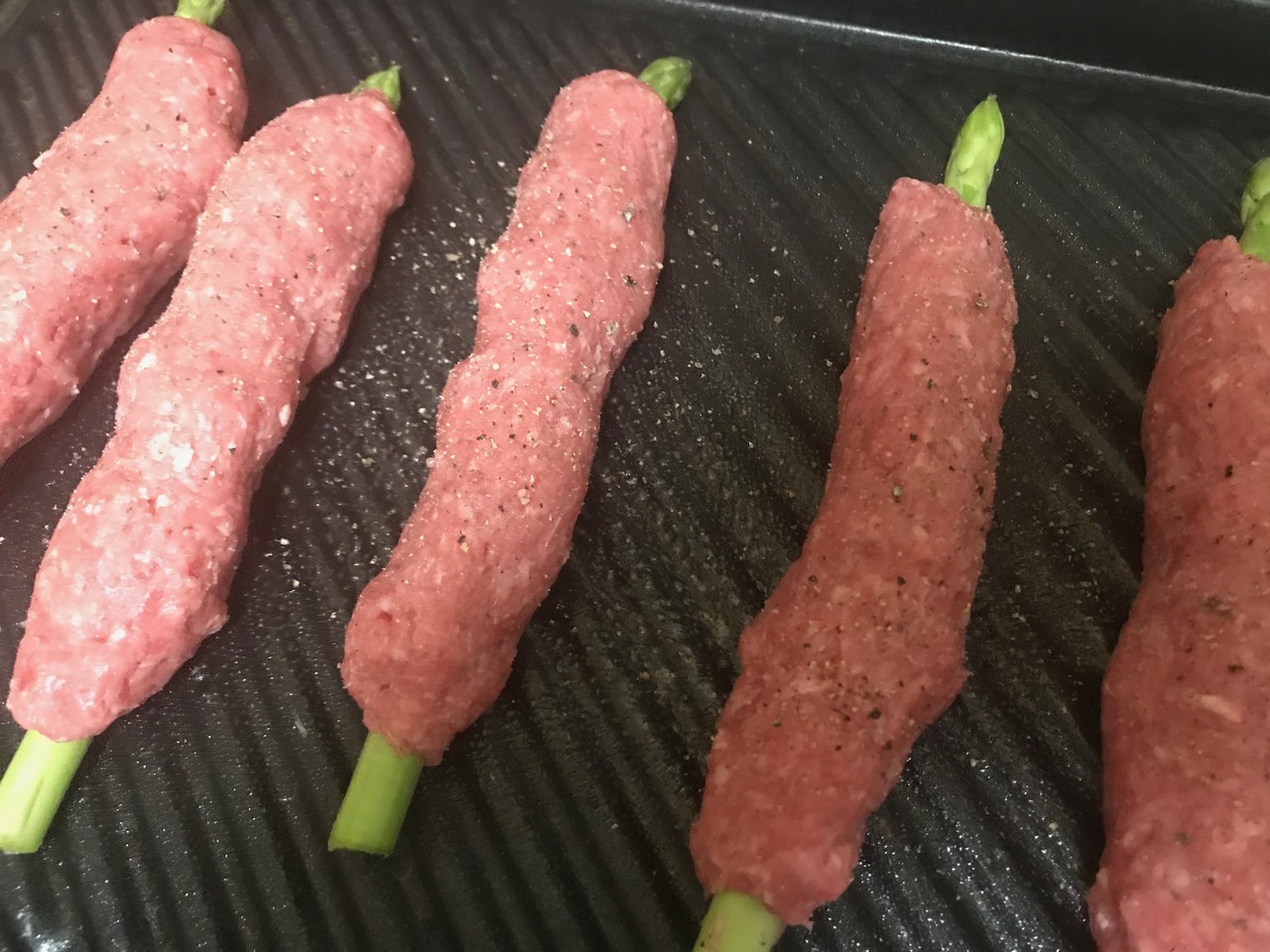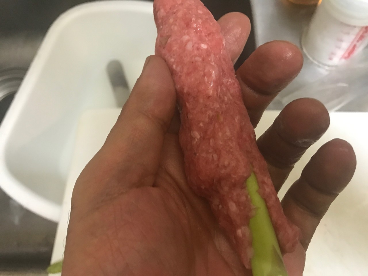 アスパラの食べられないところを切り落として、ひき肉をまとわりつかせていきます。あんまり肉を厚くしないほうがいいです。細いアスパラで5本できました。