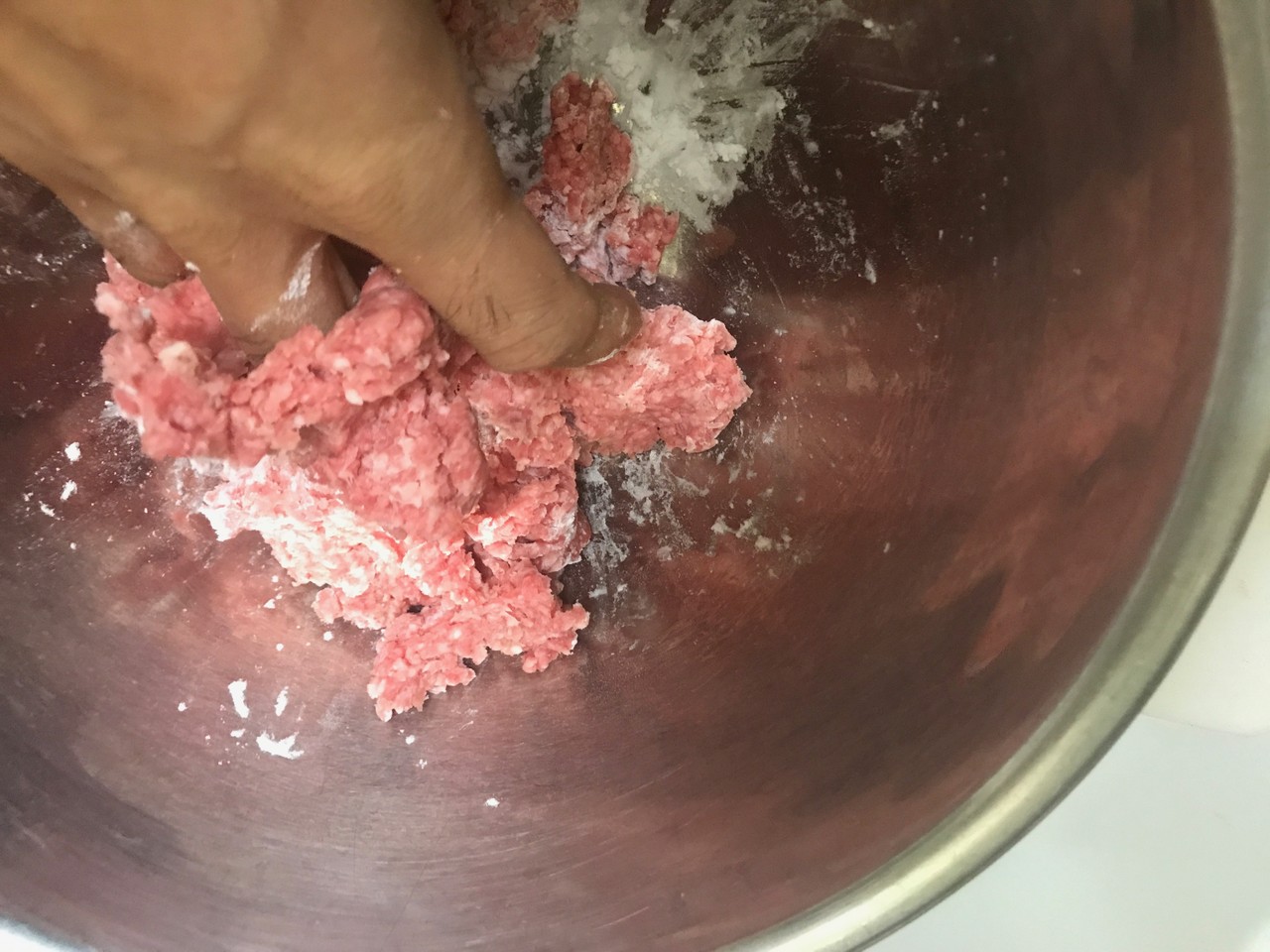 強めの塩コショウ、片栗粉大さじ2を入れて、よーーーく練ります。玉ねぎだとかいろいろ入れたくはなるんですが、いろいろ入れちゃうとタネが柔らかくなっちゃって、うまくいかないです。