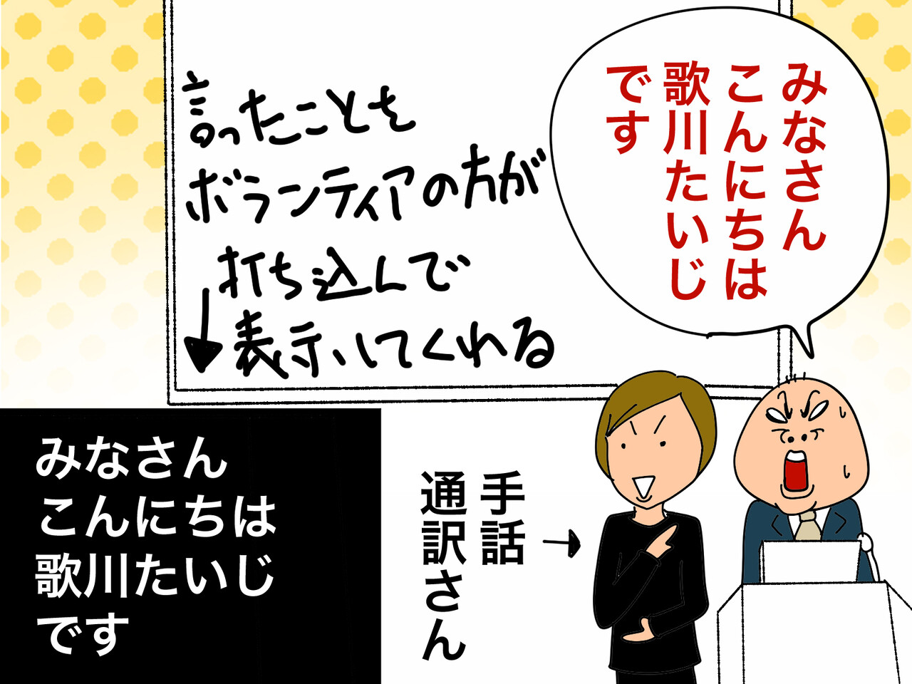 さて、講演会本番。舞台上には、聴覚にハンディのある方のために、テキスト打ち込みボランティアさんが、私が言ったことをリアルタイムでパネルに表示してくださいました。
