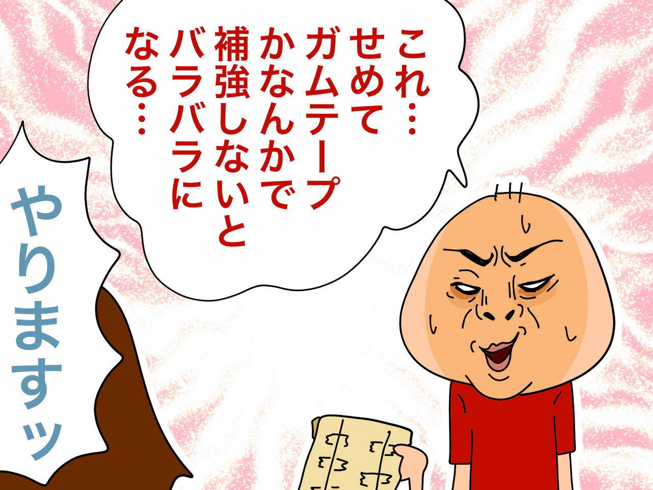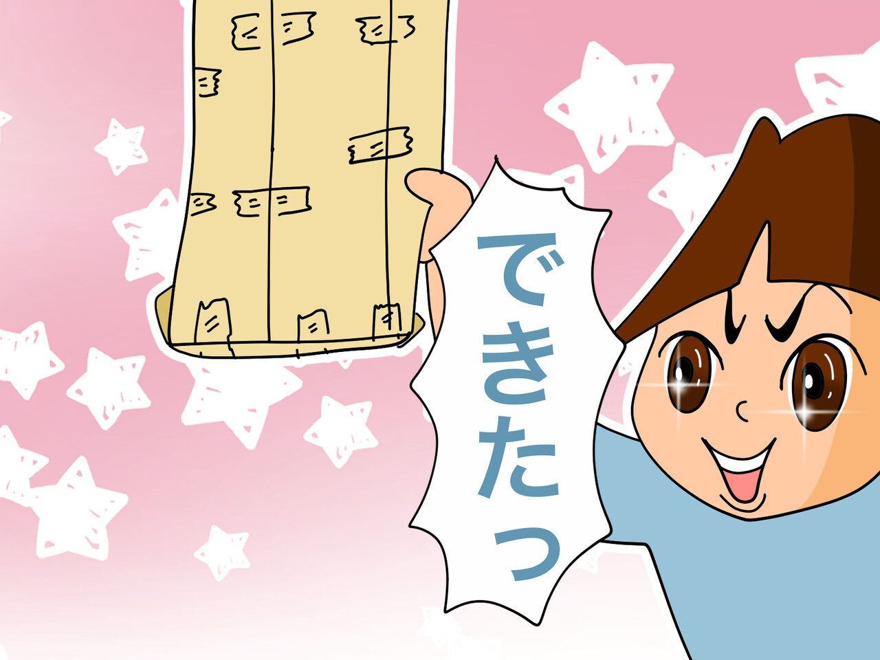できあがったのは、2枚の封筒を解体してつなぎあわせ、セロハンテープでべったべたに留めた…