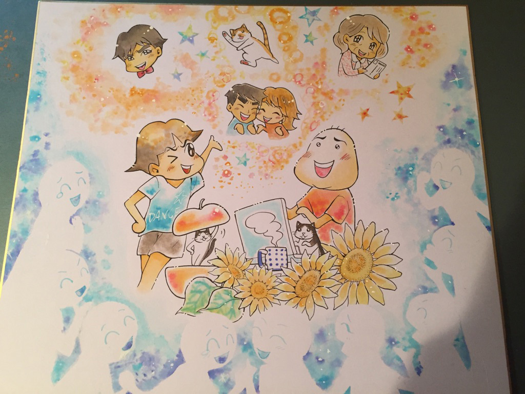「まんが家のアシスタントをやってます」とおっしゃるお客さまが、おいしいお菓子といっしょに、色紙にイラストを描いてきてくださいました。キャラクターひとりひとりに対して愛情を込めてくださったことが、ものすごく嬉しゅうございました☆ ありがとうございます☆